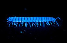 Unlike many other millipede species Pleuroloma flavipes, also commonly known as the ‘traveling cherry millipede’ or ‘wandering cherry millipede’, have been known to move en masse. In one unusual instance on August 31,1950, an aggregation of about 6,000 individuals were encountered on a single bridge at McCormick's Creek State Park, in Indiana. Pleuroloma flavipes is also known to illuminate and will fluoresce under 365 nanometer ultraviolet light.